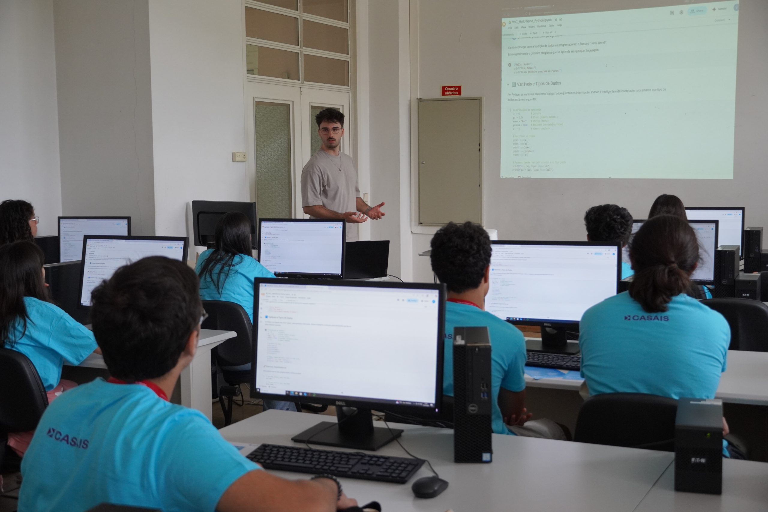The session Hello, World! introduced students to Python programming in an accessible way using the interactive Jupyter Notebook environment; the participants explored fundamental concepts, encouraging critical thinking and practical learning.