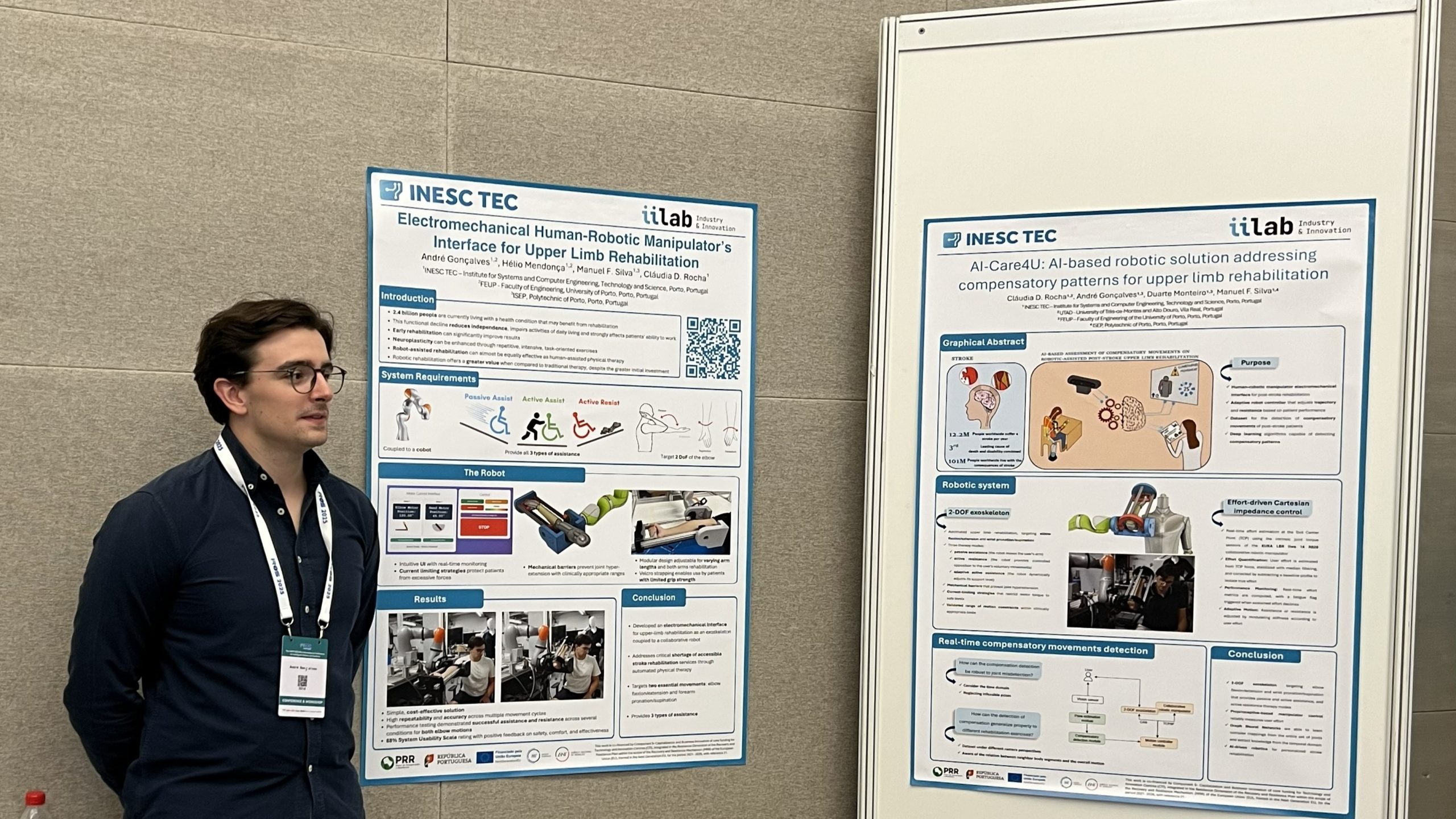 André Gonçalves, que desenvolveu a sua tese de mestrado no INESC TEC, apresentou no IROS 2025 um exoesqueleto, com dois graus de liberdade, desenvolvido pelo Instituto para auxiliar na reabilitação do membro superior em pacientes que sofreram um AVC. A estrutura de suporte foi projetada para apoiar movimentos do cotovelo e do pulso. Os testes experimentais para validação de desempenho do sistema confirmaram que o exoesqueleto conseguia fornecer diferentes modos de terapia – assistência passiva e ativa e resistência ativa.