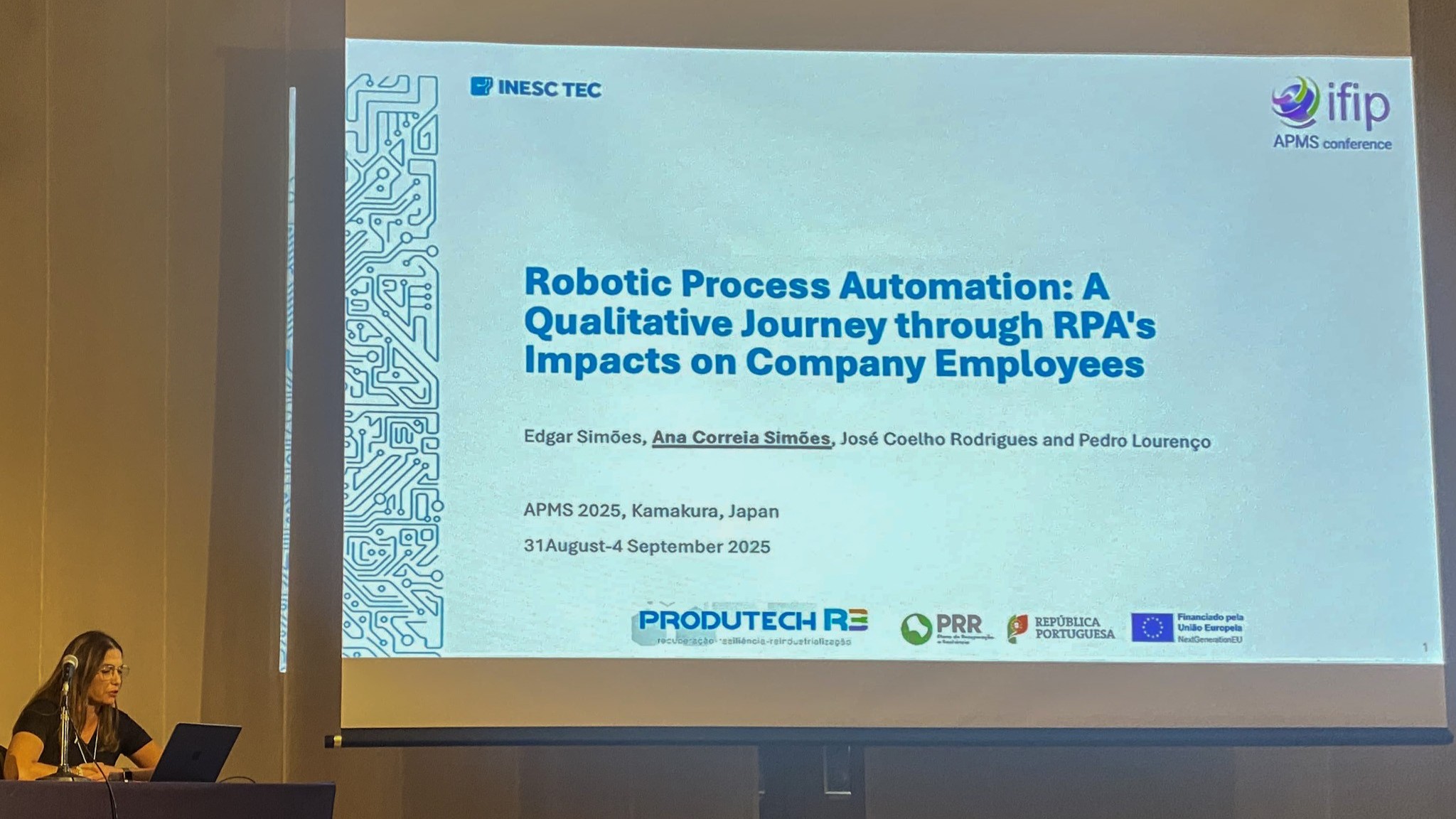 Por fim, Ana Simões apresentou o artigo “Robotic Process Automation: A Qualitative Journey Through RPA’s Impacts on Company Employees”. Este artigo foi feito em coautoria com o Kaizen Institute, é referente à Agenda PRODUTECH R3 e resulta de uma investigação qualitativa sobre os impactos da automação robótica de processos (RPA) nos colaboradores e nos modelos de governance das empresas – uma área cada vez mais relevante no contexto da transformação digital. A Agenda PRODUTECH R3 visa capacitar a fileira das tecnologias de produção em Portugal para a transição digital e verde, promovendo o desenvolvimento de novos produtos/serviços, a formação profissional e a internacionalização da indústria nacional.