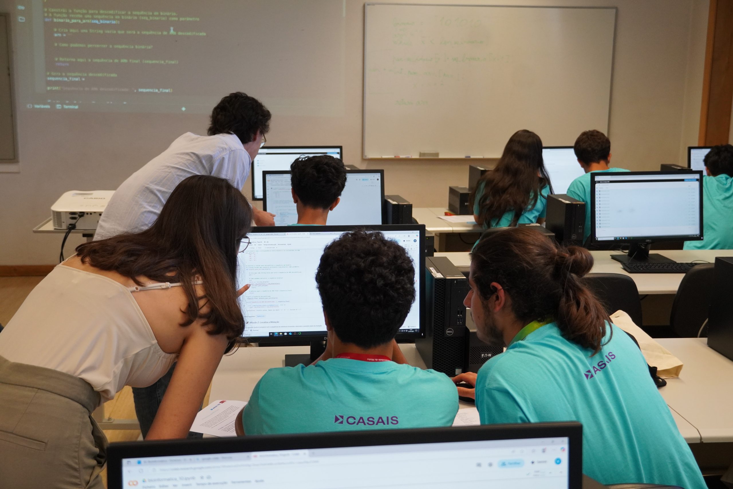 No workshop de Bioinformática, os participantes resolveram desafios genéticos usando programação em Python, evidenciando o papel da computação na investigação biomédica e promovendo o trabalho em equipa.