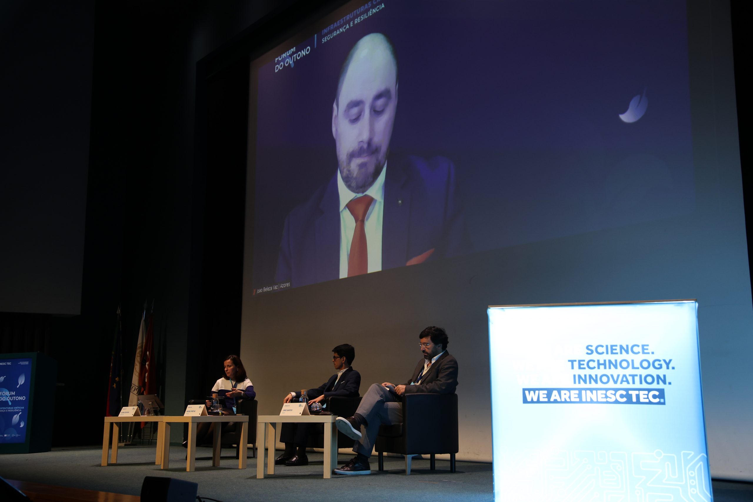 O primeiro painel de discussão do evento foi dedicado às infraestruturas físicas tecnológicas, com a participação de João Beleza Vaz (ANACOM), Miguel Freitas (E-REDES) e Lino Santos (Centro Nacional de Cibersegurança) e moderação de Clara Gouveia, Administradora do INESC TEC. Ao longo da discussão, falou-se sobre os riscos a que estas infraestruturas tecnológicas estão sujeitas, desde logo o envelhecimento de ativos, a integração de renováveis, a cibersegurança, ou os riscos de contexto geopolítico, no caso dos cabos submarinos, com exemplos de ataques perpetrados a setores como o da energia ou das comunicações.